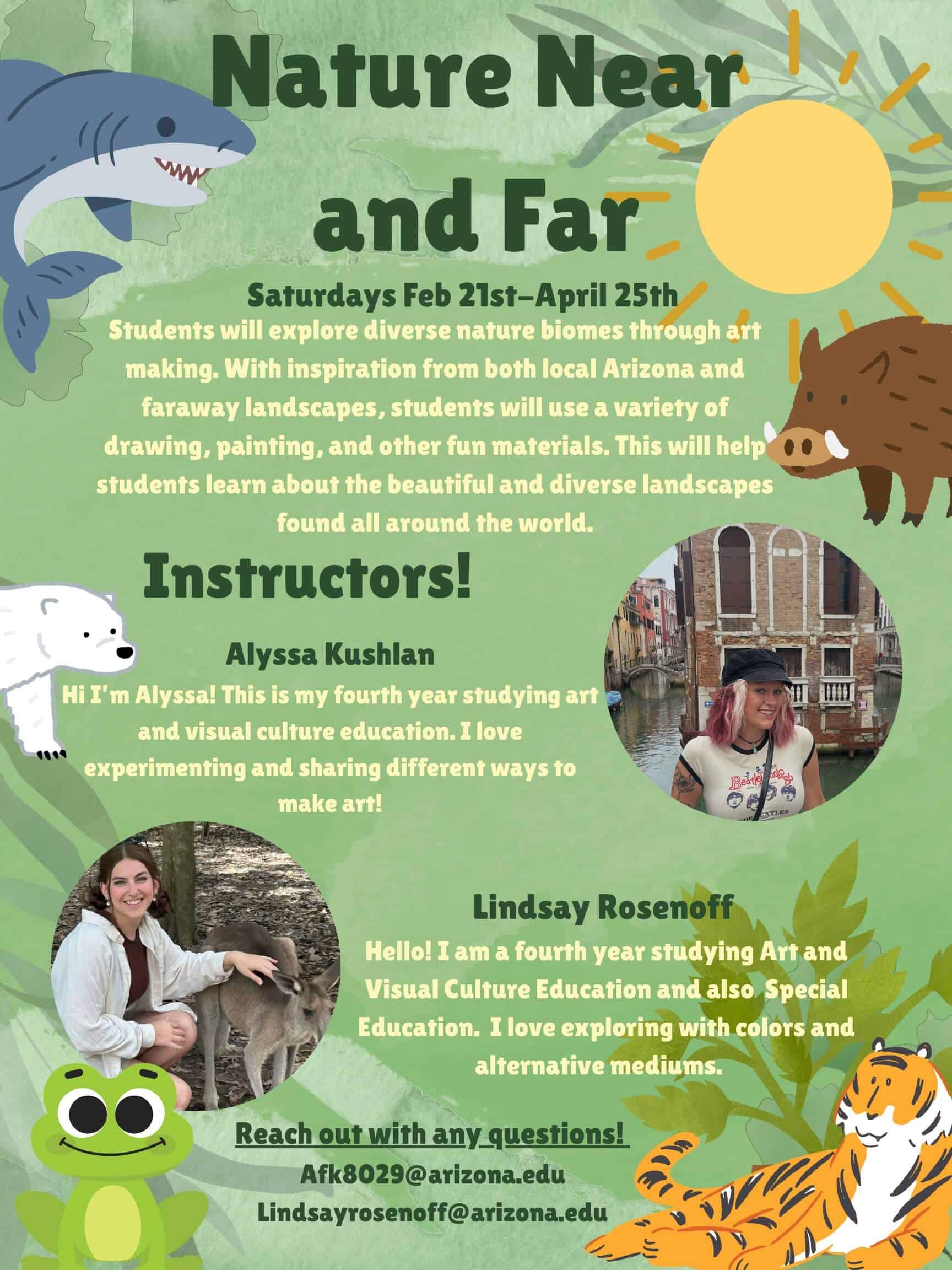Students will explore diverse nature biomes through art making. With inspiration from both local Arizona and faraway landscapes, students will use a variety of drawing, painting, and other fun materials. This will help students learn about the beautiful and diverse landscapes found all around the world.